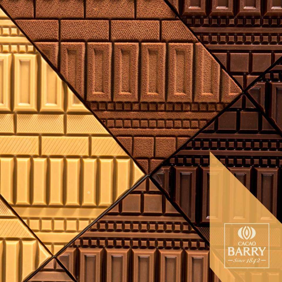 The concept of this tablet is to offer a unique taste experience. Designed with many heights and textures, the different lines and pieces of this tablet provide different sensations in your mouth. This tablet has smooth and grainy faces, can also be filled, which allows play on textures and tastes. The new Cacao Barry nuts range will harmonize perfectly with the chocolate on your tablet.