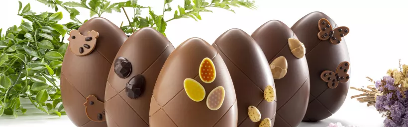 Chef Philippe Bertrand, M.O.F. Chocolatier & Director of the Chocolate Academy in France, and Thibault Doridot, Laboratory Chef at the Chocolate Academy France have worked together for over 6 years and are constantly developing and innovating in patisserie, chocolate and confectionery for the greatest pleasure of our taste buds. In this booklet, you will find many molds and recipes to create beautiful window displays for Easter and entice customers with delicious ideas!