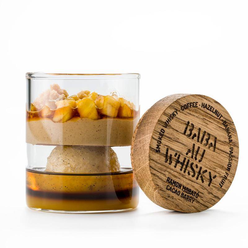 - Наконец, баба в форме десерта, который едят ложкой, с ароматом дымного виски, кофе, маракуйи, банана и взбитых сливок с кофе и фундуком.